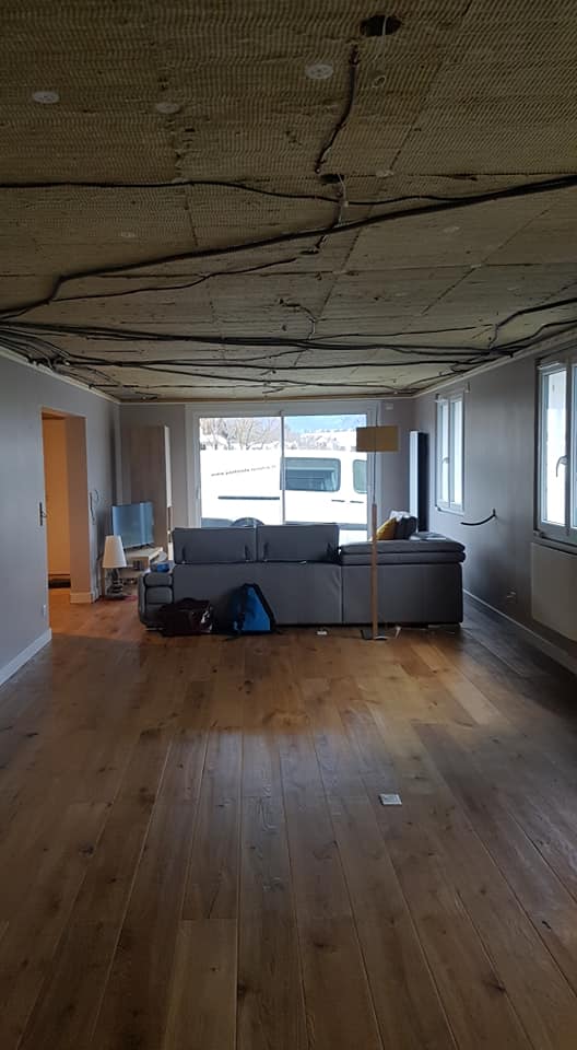 Chantier dans le pays de gex. Pose d' une toile tendu satiné blanc en 5m ( pas de lé). Lisse invisible, spots autoportés Newmat, chaises pour suspensions réglables, encastrement de hotte dans le plafond .