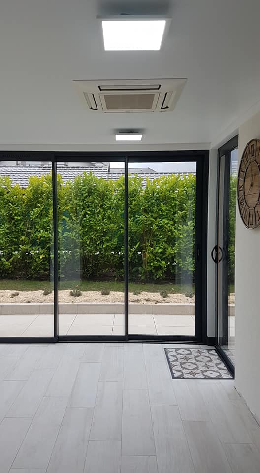 Pose d'un plafond tendu satiné blanc dans une véranda à Sevrier. Mise en place de luminaires , et encastrement d' une climatisation .